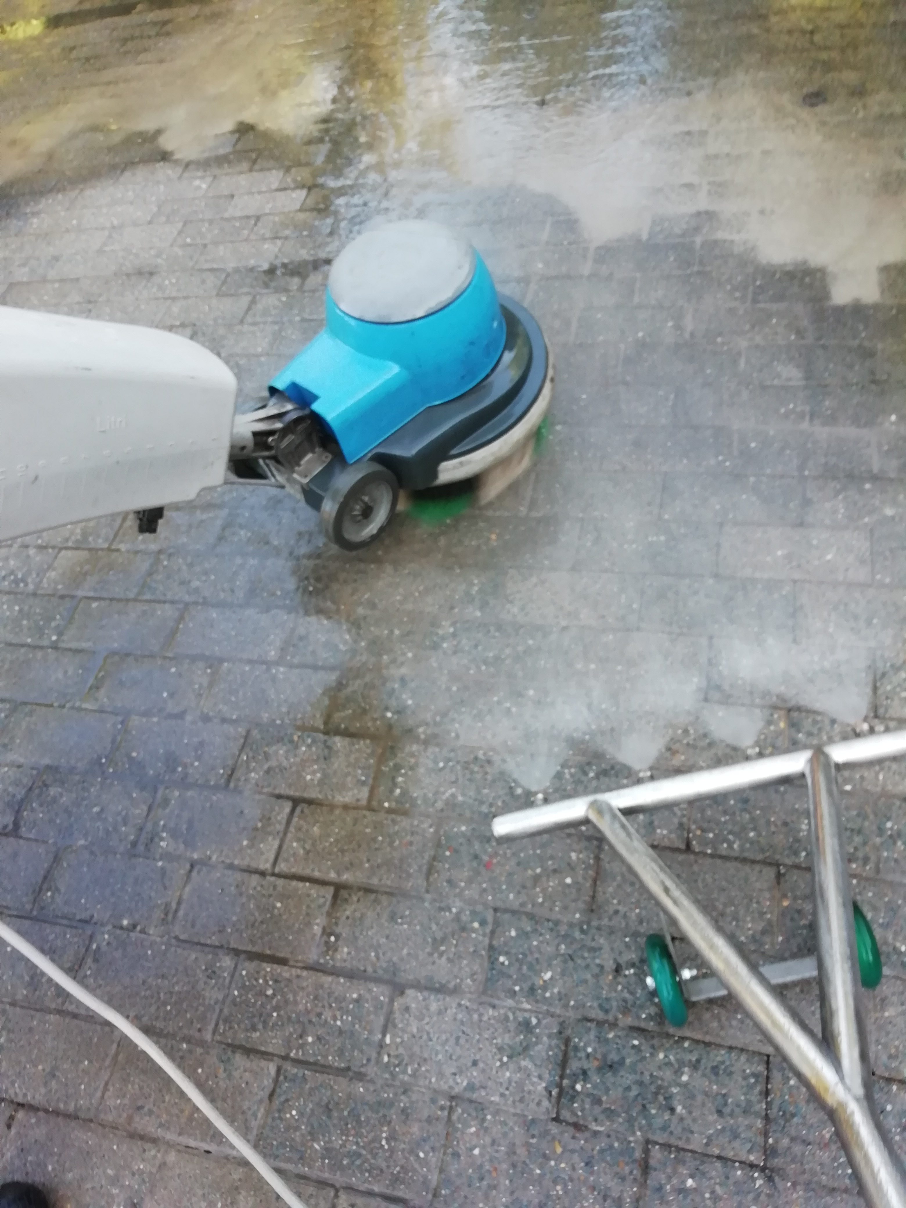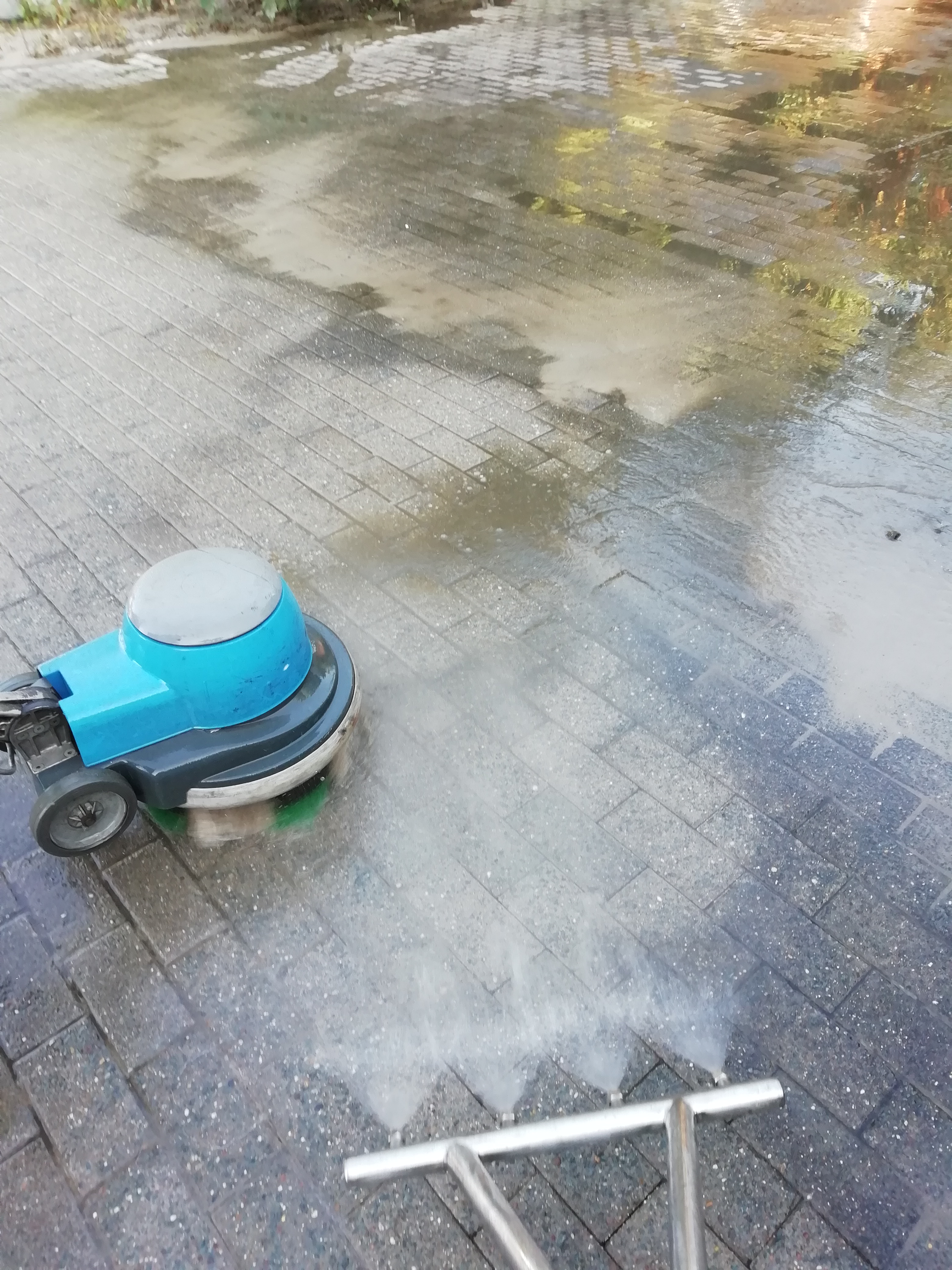 Die Wasserspülung über 4 Flachstrahldüsen verteilt wird über den Fahrwagen über die zu spülende Fläche gefahren. Im Winkel so, daß der Wasserstrahl nicht direkt zum Boden gerichtet ist, sondern eher flach. So entsteht eine Wasserverwirbelung über die Oberfläche, welche ausreicht um den aufliegenden Schmutz von der gereinigten Fläche weg spült. So wird nur der Schmutz vom Deckstein gespült und der Schmutz in der Fuge bleibt auch in der Fuge. Bei Pflastersteinverfugungen erzielt die TMC Spüllanze einen klaren Zeit- und Sauberkeitsvorteil. Selbst Bauarbeiter kaufen sich den Wasserbesen aus Edelstahl, weil es so einfach ist, damit den großen Betonschlamm wegzuspülen.